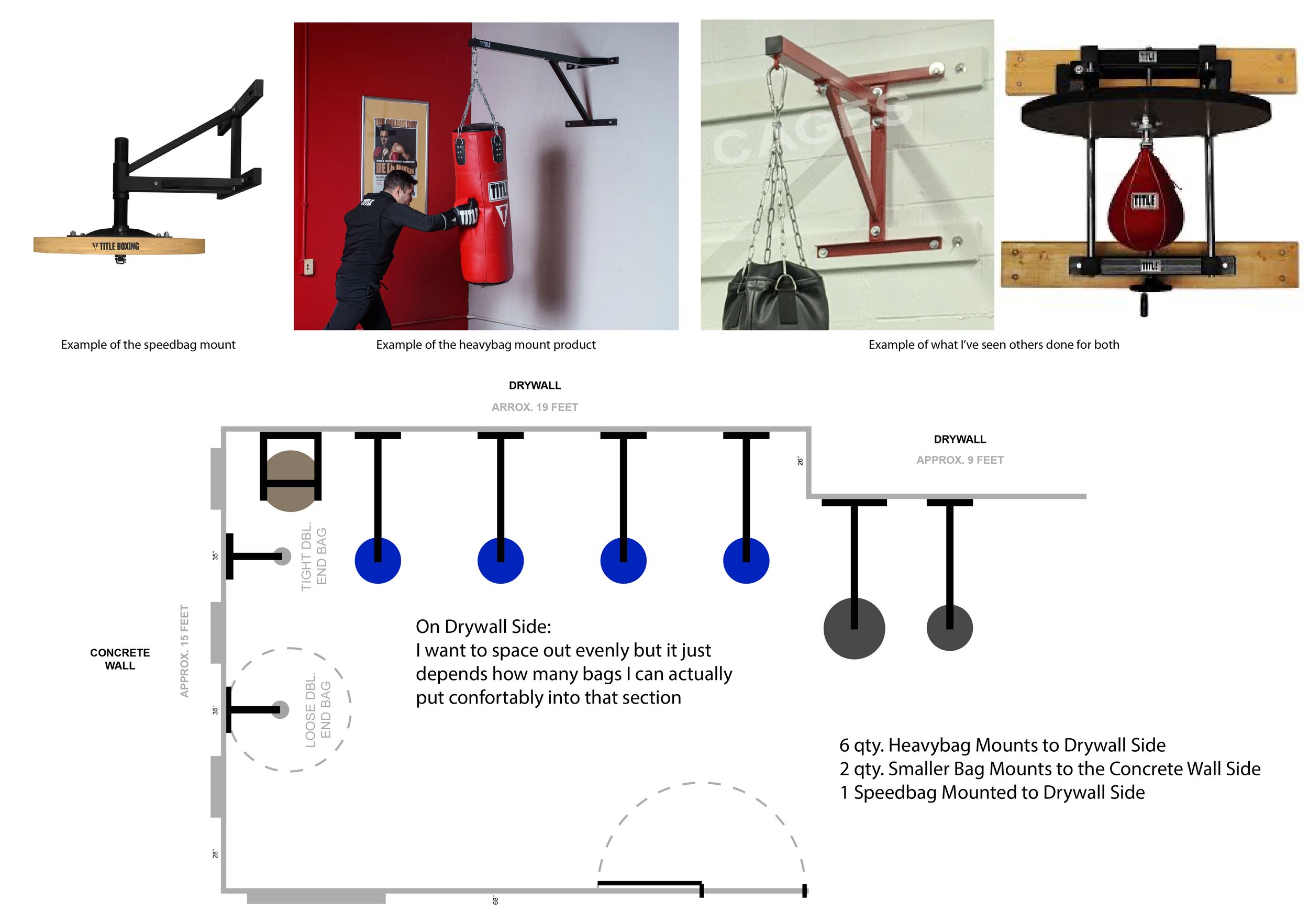 I want to install 6 heavy bag mounts to a drywall section, I have a Speed bag platform that needs to be on the drywall side as well. I also want 2 mounts into a concrete wall.